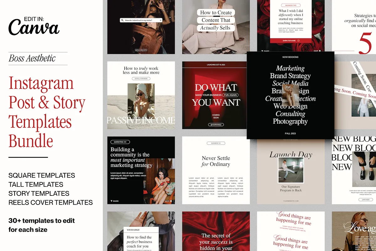 30+ Instagram Post Templates for Canva — SQUARE (1×1 ratio) 30+ Instagram Post Templates for Canva — TALL (5×4 ratio) 30+ Instagram Story / Reel Cover Templates for Canva — STORY (1080×1920 pixels) Use each template multiple times by changing the quotes, images and colours! You’ll never run out of new content for your feed.
